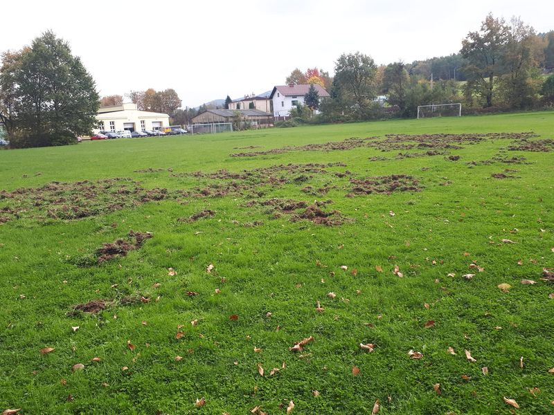 Stado dzików postanowiło przeszukać głębsze warstwy murawy i zrobiło to na naprawdę sporym terenie.