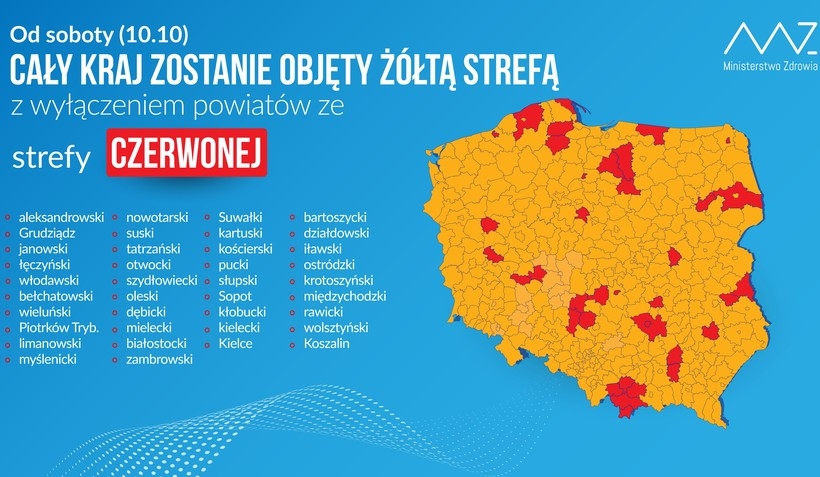 Od 9 października natomiast Rządowe Centrum Bezpieczeństwa będzie wysyłało wiadomości sms do mieszkańców powiatów, które weszły do strefy czerwonej.