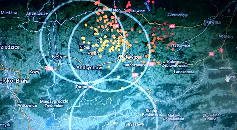 W pewnym momencie wyładowań nad Wadowicami i okolicą przybywało w zatrważającym tempie (Fot. lightningmaps.org)