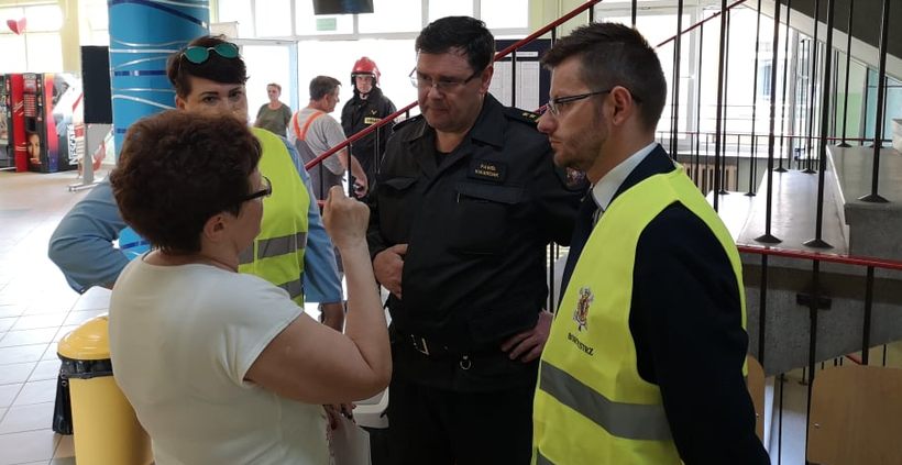 W trakcie akcji strażacy zarządzili ewakuacje 350 osób z budynku. Młodzież i pracownicy placówki wyszli z budynku i zgromadzili się na boisku. Szefowa zarządzania kryzysowego miasta Beata Mamcarczyk zapewniła zgromadzonym na boisku szkolnym dostęp do wody pitnej. W środę w południe na zewnątrz panował bardzo duży upał.