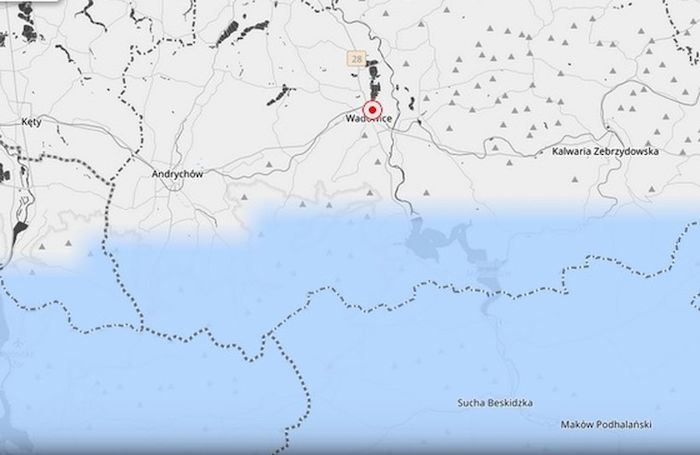 Najwięcej śniegu spadnie w południowych częściach gmin Andrychów i Wadowice, a także w okolicach Mucharza. ( fot. kadr z mapy IMGW)