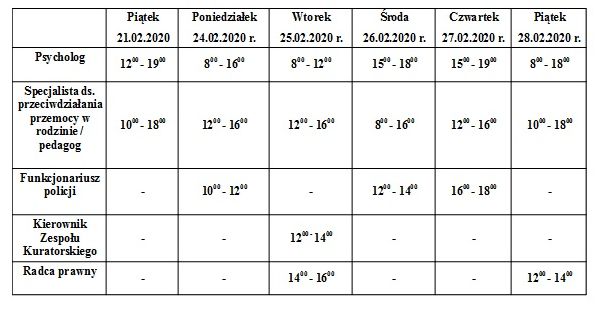 W związku z Ogólnopolską Akcją „Tydzień Pomocy Osobom Pokrzywdzonym Przestępstwem”, w dniach 21- 28 lutego, w Ośrodku Interwencji Kryzysowej w Radoczy pełnione będą dyżury przez specjalistów: radcę prawnego, kierownika zespołu kuratorskiego z Sądu Rejonowego w Wadowicach, funkcjonariuszy Policji, psychologa, specjalistę ds. przeciwdziałania przemocy w rodzinie.