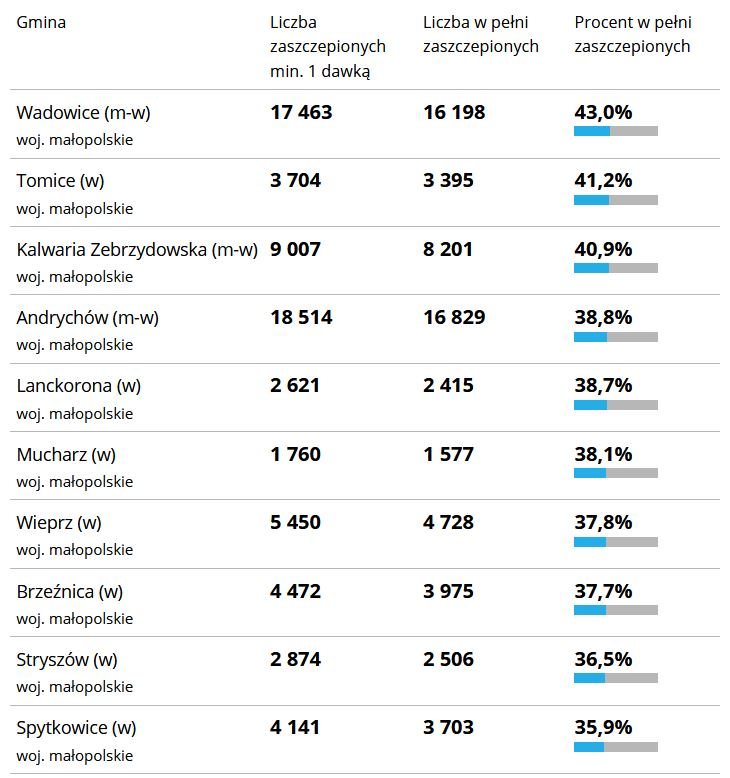 Najlepiej szczepienia przebiegają w punktach w Wadowicach, gdzie szczepią się mieszkańcy Wadowic i okolic, a także mieszkańcy gminy Tomice. To właśnie w tych dwóch gminach zabezpieczenie przed koronawirusem jest największe. W gminie Wadowice zaszczepionych jest już 43 procent populacji.