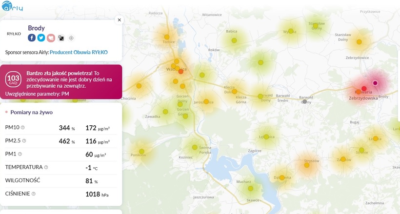Pogoda sprzyja pozostawaniu ciężkiego, śmierdzącego powietrza w dolinach. Po raz kolejny zimowy poranek przywitał mieszkańców Wadowic poważnymi przekroczeniami norm jakości powietrza. Czujniki airly pokazywały ponad 200% wartości dla pyłów PM2,5 i 160% dla pyłów PM10.