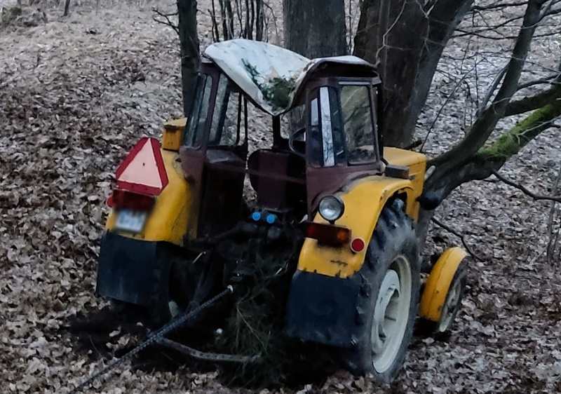 Według zgłoszenia doszło tutaj do wypadku z udziałem ciągnika rolniczego, na który przewróciło się drzewo. Kierowca siedzący w środku został poszkodowany.