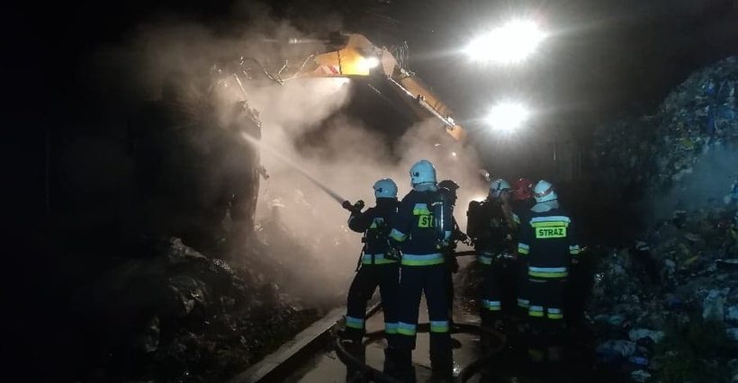 Strażacy i druhowie zabezpieczyli teren i dogaszają żar wewnątrz wysokiej na 3,5 metra pryzmy odpadów zmieszanych, gdzie doszło do zaprószenia. Przeszukany zostanie również pozostały obszar składowiska. Akcja potrwa jeszcze kilka godzin.