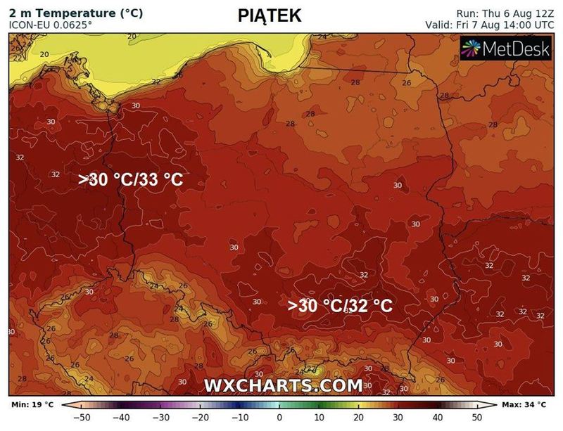 Dynamiczny napływ polarnej masy powietrza przyniesie w trakcie ostatnich dni bieżącego tygodnia eksplozję iście letniej aury z najwyższymi wzrostami temperatury maksymalnej powietrza powyżej 32 °C/34 °C – napisał Grzegorz Zawiślak, znany łowca burz.