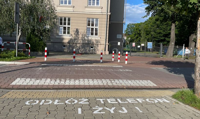 W Wadowicach przejścia dla pieszych przy szkołach podstawowych zdobią wielkie napisy „Odłóż telefon i żyj!”.