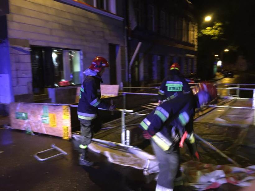 Metalowa konstrukcja rozsypała się na całej szerokości ulicy i uderzyła w budynek po przeciwnej stronie. Przejazd Fatimską został zablokowany. Strażacy usuwają metalowe pręty. Zdecydowali też o kontroli budynku od góry. W kamienicy remontowano bowiem dach. Ratownicy chcą upewnić się, że elementy budowlane nie będą nikomu zagrażać.