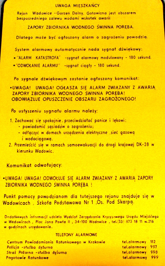 Warto jednak zapoznać się dokładnie z rozpiską, którą rozmieściło RZGW na terenach zalewowych. Wskazane są w nich bowiem nie tylko sygnały alarmowe, ale także adresy punktów pomocy powodzianom, w przypadku Jaroszowic jest to Szkoła Podstawowa nr 1 w Wadowicach, na os. Pod Skarpą.