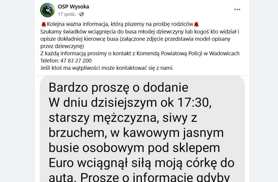 W dniu dzisiejszym, ok. godz. 17.30 starszy mężczyzna, siwy z brzuchem, w kawowym jasnym busie osobowym pod sklepem Euro wciągnął siłą moją córkę do auta. Proszę o informację, gdyby ktoś coś wdział – czytamy w internetowym komunikacie opublikownym przez matkę dziewczyny.