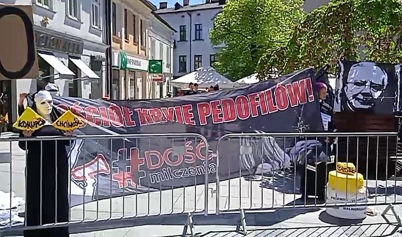 Aktywiści urządzili przedstawienie, którego treści nawiązywały do afer pedofilskich w Kościele Katolickim. Uważają, że pochodzący z Wadowic papież Jana Paweł II ponosi odpowiedzialność za wykorzystywanie seksualne dzieci przez księży za czasów jego pontyfikatu.