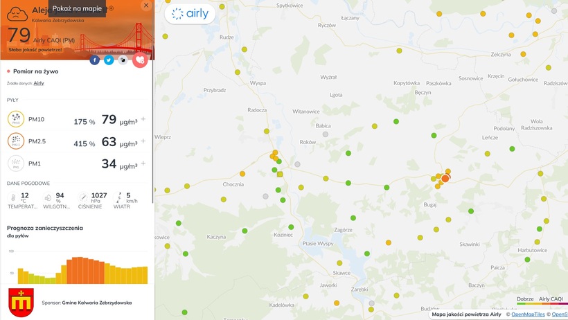 Jeszcze wyższe wskaźniki przekroczeń norm pyłu PM10 odnotowano w Kalwarii Zebrzydowskiej. Przy ulicy Broniewskiego oraz na Jagiellońskiej, a nad ranem trujący smog unosił się nad centrum miasta, gdzie jeszcze przed południem wskazania dla pyłu PM10 wynosiły 173 proc., a dla pyłu PM 2,5 aż 2,5 proc.