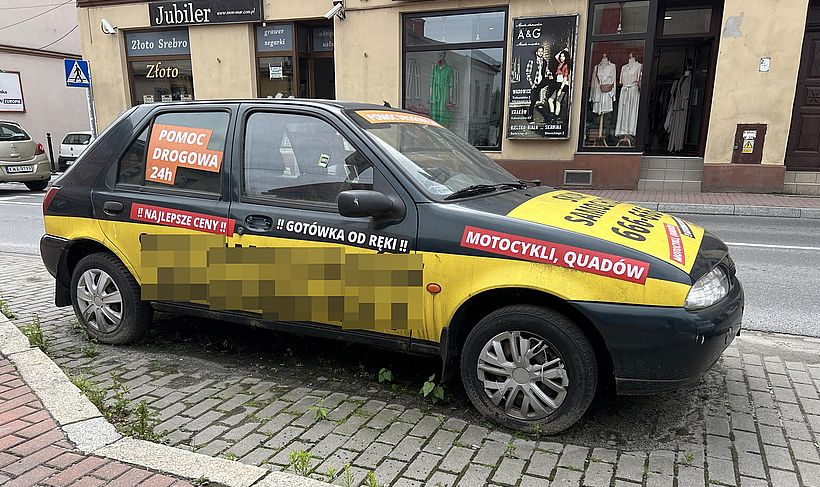 Stary grat oblepiony jest reklamą i jak można przypuszczać, jego właściciel taki sobie pomysł wymyślił na promowanie swoich usług. Szkopuł w tym, że miejskie parkingi nie do tego są przeznaczone.