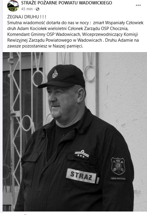 Smutna wiadomość dotarła do nas w nocy : zmarł Wspaniały Człowiek druh Adam Kociołek […] Druhu Adamie na zawsze pozostaniesz w Naszej pamięci – czytamy m.in. na stronie Facebook OSP w Choczni.