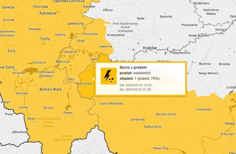 We wtorek (23.05) pogoda bardzo się zmieni w powiecie wadowickim. W godzinach popołudniowych może zrobić się nawet groźnie. Instytut Meteorologii i Gospodarki Wodnej wydał ostrzeżenie pierwszego stopnia przed burzami a gradem.
