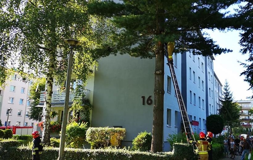 Niestety samochód strażacki z drabiną nie był w stanie bezpiecznie podjechać pod blok, dlatego zdecydowano się na ręczną drabinę. W akcji ratunkowej wzięło udział czterech strażaków.