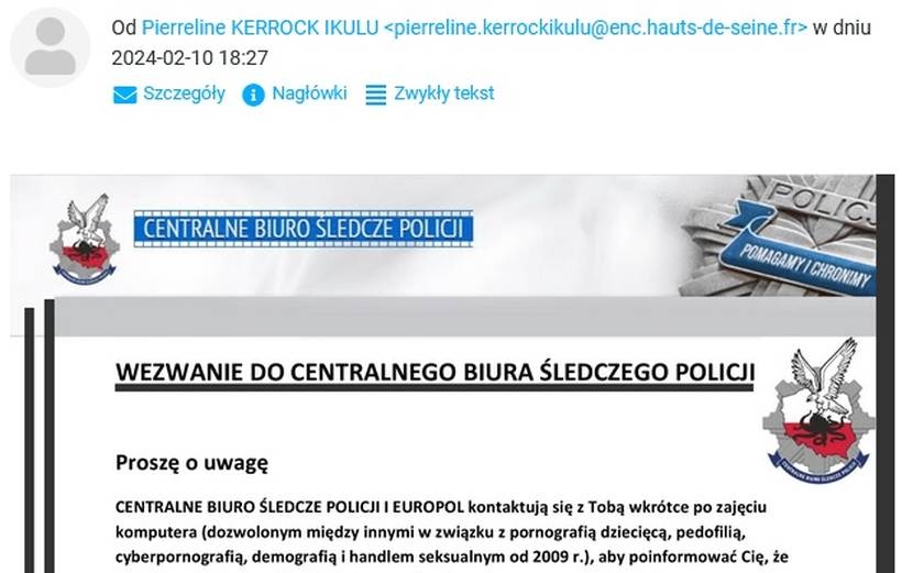 Już sam email nadawcy powinien wzbudzić nasz niepokój. Email jest kompilacją adresów sterujących, że autor wiadomości może pochodzić z innych krajów Unii Europejskiej.