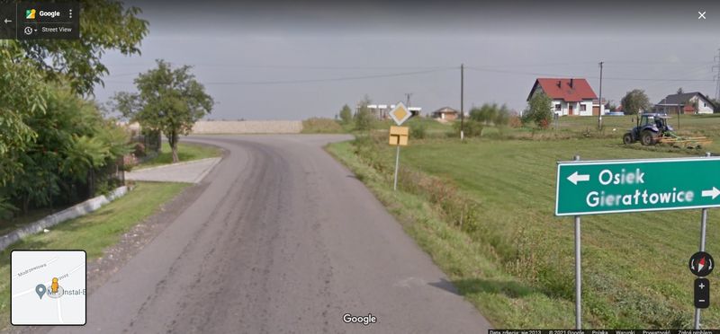 Miejsce to jest bardzo dobrze oznakowane. Pierwszeństwo jazdy mają osoby poruszające się wyprofilowanym zjazdem jezdni Brzosy – Beskidzka ( na trasie Osiek – Wadowice). Fot. Google Maps