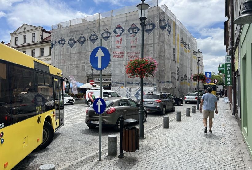 Kierowca dostawczaka zaparkował tuż przy remontowanej kamienicy. Wąska jezdnia, której prześwit został zmniejszony przez rusztowanie budowlane, zrobiła się jeszcze węższa i uniemożliwiła przejazd autobusowi.