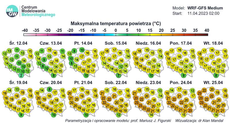 Co ciekawe jeszcze cieplej ma być w przyszłym tygodniu. Jak widzimy na modelach numerycznych publikowanych przez IMGW, w drugiej połowie przyszłego tygodnia w ciągu dnia może być nawet powyżej 20 stopni Celsjusza.