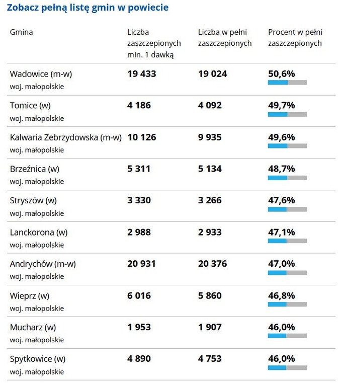 Najwięcej zaszczepionych mieszkańców przeciwko Covid-19 jest gminie Wadowice. Tutaj w pełni zaszczepionych, czyli dwiema dawkami preparatów od firm Pfizer/BioNTech, Moderna i AstraZeneca lub jednodawkową szczepionką Johnson & Johnson, jest 19.024 osób, co stanowi 50,6 proc. populacji.