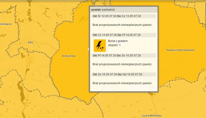W środę (12.05) około południa do powiatu wadowickiego dotrą deszczowe chmury i może zagrzmieć. Choć ostrzeżenie meteo przed burzami obowiązują dopiero od czwartku (13.05). ( Fot. kadr z mapy IMGW)