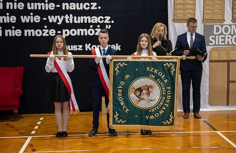 Podstawówka w Dąbrówce postarała się o sztandar. Z tej okazji w szkole odbyła się miła uroczystość, która poświęcona była między innymi patronowi szkoły Januszowi Korczakowi.