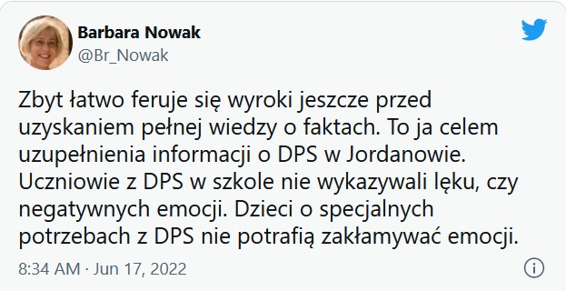 To ja celem uzupełnienia informacji o DPS w Jordanowie. Uczniowie z DPS w szkole nie wykazywali lęku, czy negatywnych emocji. Dzieci o specjalnych potrzebach z DPS nie potrafią zakłamywać emocji – napisała na Twitterze Barbara Nowak.