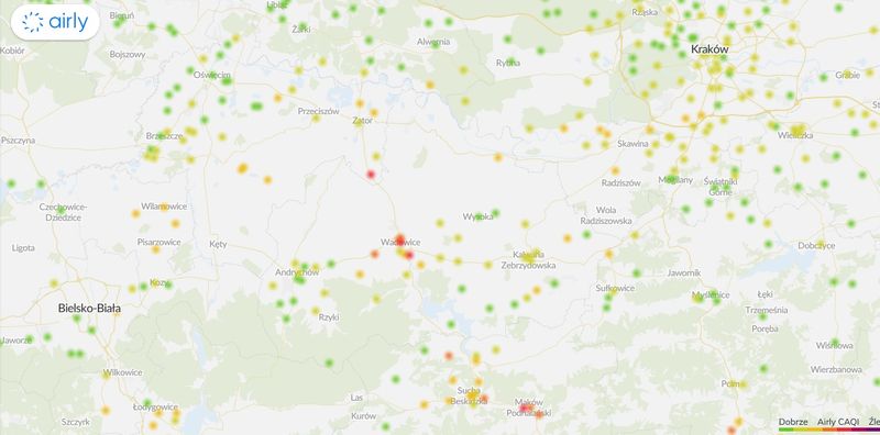 Na mapie Airly, którą można śledzić TUTAJ, wyraźnie było widać, że to Wadowice „świecą się” na czerwono w całym regionie. Na pewno pod względem jakości powietrza było tutaj najgorzej w całym powiecie wadowickim.
