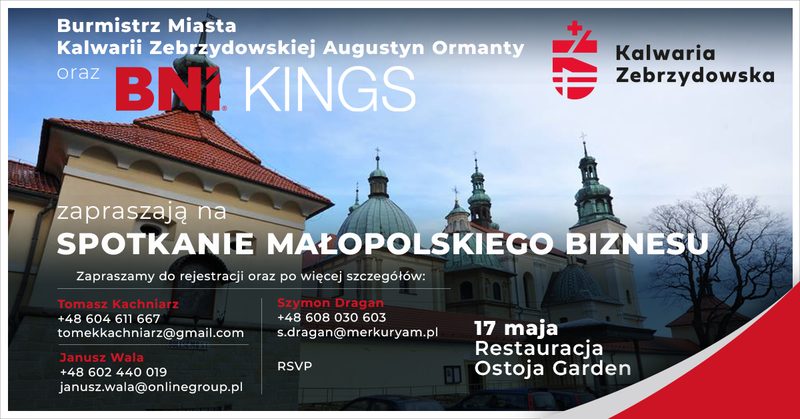 Kalwaria Zebrzydowska zaprasza na spotkanie grupy BNI KINGS pod auspicjami burmistrza Kalwarii Zebrzydowskiej Augustyna Ormantego. Ma to być doskonała okazja do wymiany doświadczeń, podzielenia się swoją wiedzą, zdobycia nowych kontaktów biznesowych.