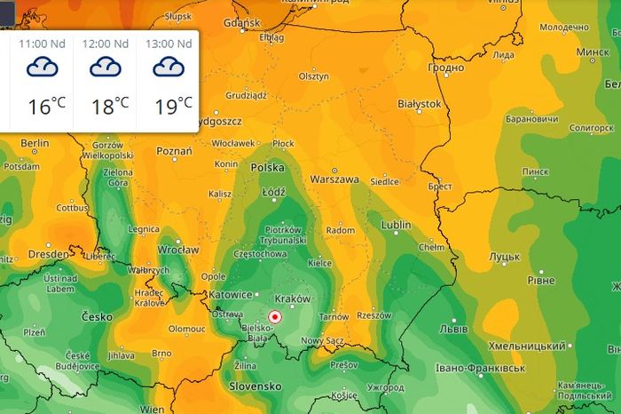 Synoptycy ostrzegają jednak przed dość silnymi powiewami wiatru. Na mapach widać, że powiat wadowicki nie jest zagrożony. Większa część małopolski będzie najspokojniejszym pod tym względem terenem. [ foto. meteo.imgw.pl]