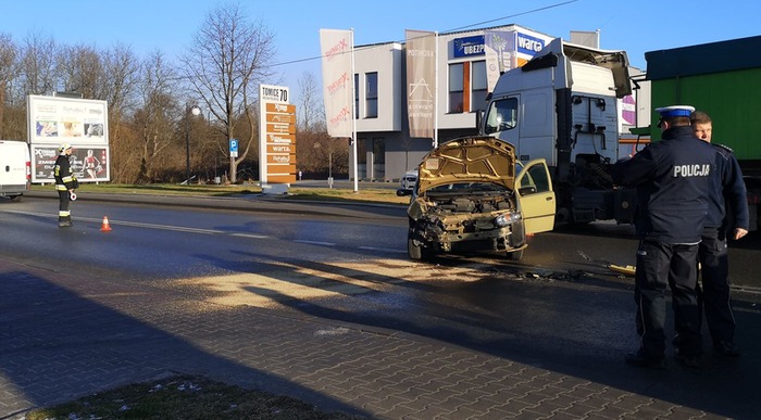 W środę przed południem (8.01) samochód osobowy Fiat Punto zderzył się z ciężarówką Scania. Osobówka jest zniszczona. Rannym kierowcą samochodu zajęli się ratownicy pogotowia. Jednocześnie auto ciężarowe nie uległo większym uszkodzeniom.