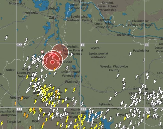 Co ciekawe sama burza ominęła miasto Wadowice i niejako okrążyła je. Błyskawice przeszły z kierunku Suchej Beskidzkiej i Żywca w stronę Kalwarii Zebrzydowskiej, a także skierowały się do Zatora. [grafika: www.blitzortung.org].