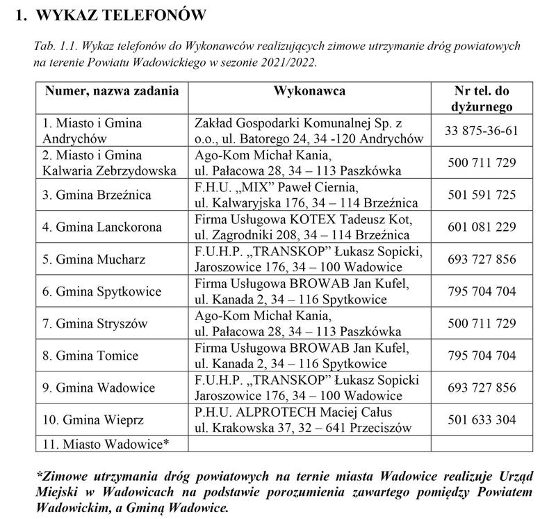 Starostwo powiatowe w Wadowicach podało informacje dotyczące zimowego utrzymania dróg powiatowych. Wykaz firm i numery do nich podane są w grafice poniżej.