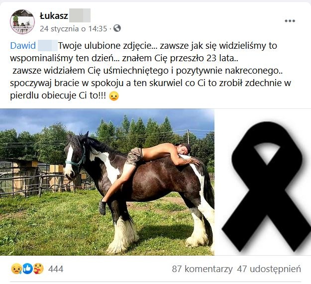Twoje ulubione zdjęcie… zawsze jak się widzieliśmy to wspominaliśmy ten dzień… znałem Cię przeszło 23 lata. .. zawsze widziałem Cię uśmiechniętego i pozytywnie nakręconego.. spoczywaj bracie w spokoju a ten skurwiel co Ci to zrobił zdechnie w pierdlu obiecuje Ci to!!! – napisał Łukasz w publicznym poście na Facebooku. W kolejnym dodał: – Nie chciałem wcześniej publikować w jakich okolicznościach zginął Dawid dopóki nie będę miał konkretów z policji. Nie wszyscy wiedzą, Dawid został zamordowany nożem. Sprawcy zostali zatrzymani. Póki co więcej informacji nie mogę udzielać. Pogrzeb Dawida odbędzie się w środę o godzinie 12:30 różaniec a o 13:00 msza św. w Wysokiej. P.S proszę osoby które chcą pożegnać Dawida o przekazanie informacji innym. Ja mam jeszcze setki spraw do ogarnięcia proszę o wyrozumiałość.