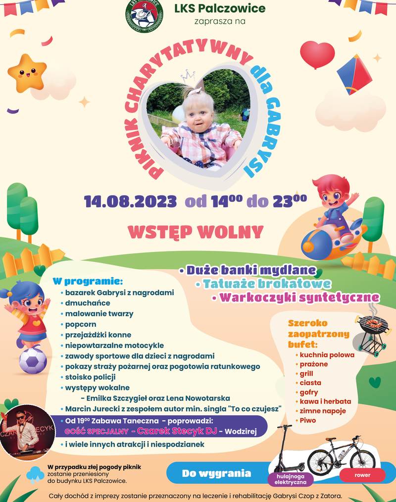 Działacze klubu sporotwego w Palczowicach ( gmina Zator) organizują piknik charytatywny dla niepełnosprawnej Gabrysi Czop. Rodzina małej mieszkanki Zatora potrzebuje wsparcia finansowego w rehabilitacji i leczeniu maluszka. Każdy jest zaproszony.
