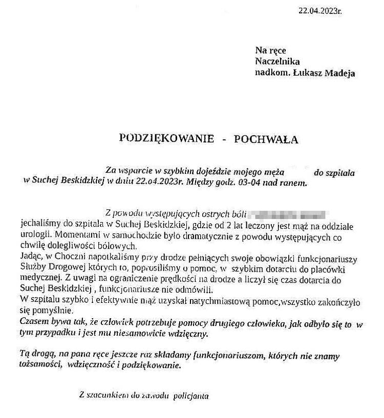 Pod koniec kwietnia tego roku, do policjantów ruchu drogowego, którzy pełnili swoje obowiązki służbowe na ul. Tadeusza Kościuszki w Choczni, podjechał samochód marki Volkswagen. Z pojazdu wybiegła zdenerwowana kobieta, prosząc mundurowych o pomoc w szybkim dotarciu do szpitala w Suchej Beskidzkiej.