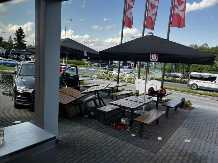 Zjechała z ronda prosto w… stoliki restauracyjne. Co stało się pod KFC w Wadowicach?