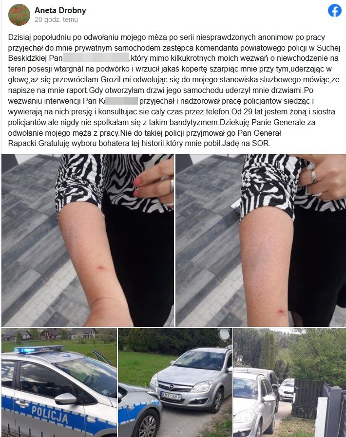 Dzisiaj po południu po odwołaniu mojego męża po serii niesprawdzonych anonimów po pracy przyjechał do mnie prywatnym samochodem zastępca komendanta powiatowego policji w Suchej Beskidzkiej (…) mimo kilkukrotnych moich wezwań o niewchodzenie na teren posesji wtargnął na podwórko i wrzucił jakąś kopertę szarpiąc mnie przy tym, uderzając w głowę, aż się przewróciłam. Groził mi odwołując się do mojego stanowiska służbowego mówiąc, że napiszę na mnie raport. Gdy otworzyłam drzwi jego samochodu uderzył mnie drzwiami. Po wezwaniu interwencji Pan K. przyjechał i nadzorował pracę policjantów siedząc i wywierają na nich presję i konsultując sie cały czas przez telefon. Od 29 lat jestem żoną i siostra policjantów, ale nigdy nie spotkałam się z takim bandytyzmem. Dziękuje Panie Generale za odwołanie mojego męża z pracy. Nie do takiej policji przyjmował go Pan Generał Rapacki. Gratuluję wyboru bohatera tej historii, który mnie pobił. Jadę na SOR – napisała w mediach społecznościowych Aneta Drobny.